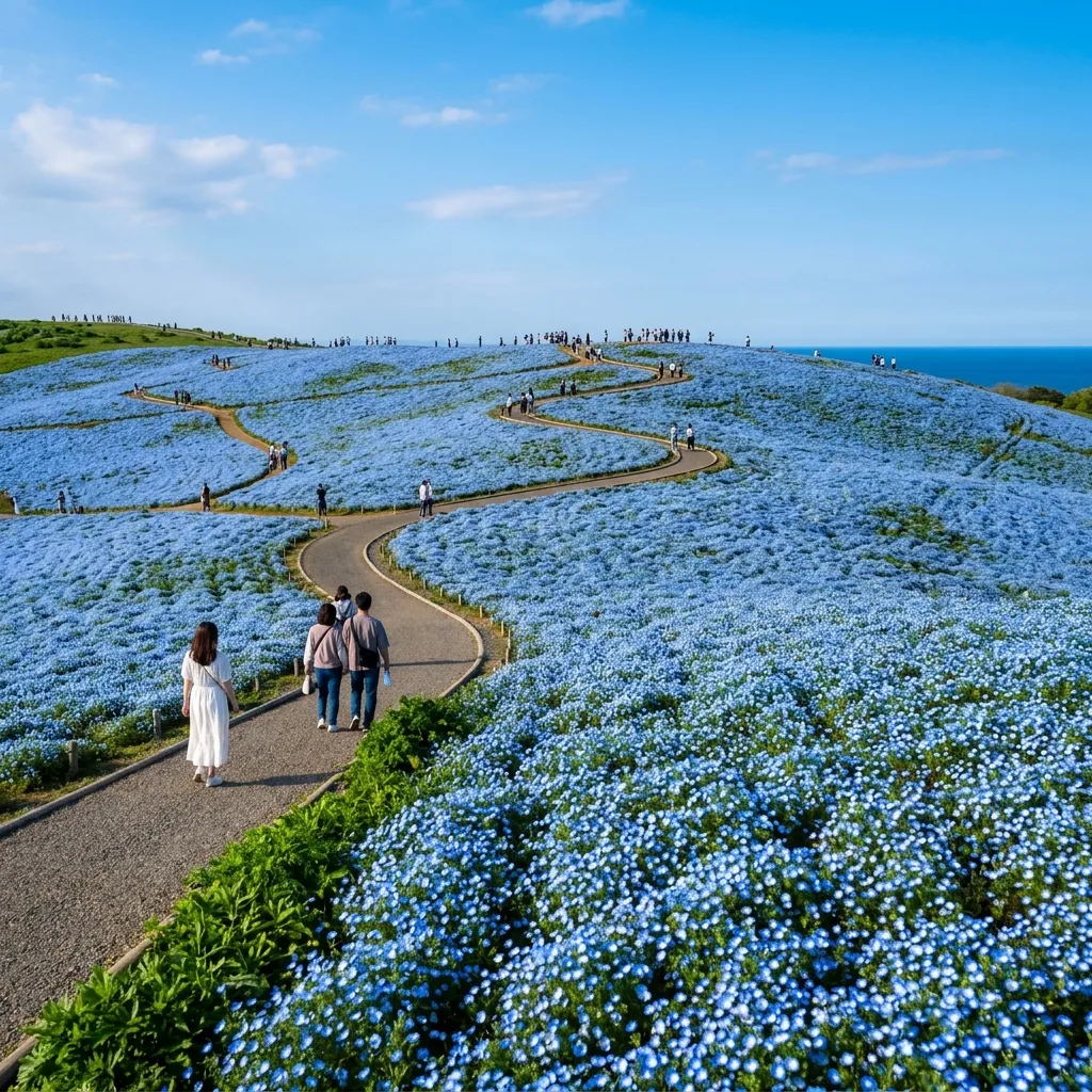 - Miopía de Nemophila: En primavera, las colinas se cubren de millones de pequeñas flores azules (Nemophila) que parecen fundirse con el cielo y el mar. Es una de las imágenes más virales de Japón.