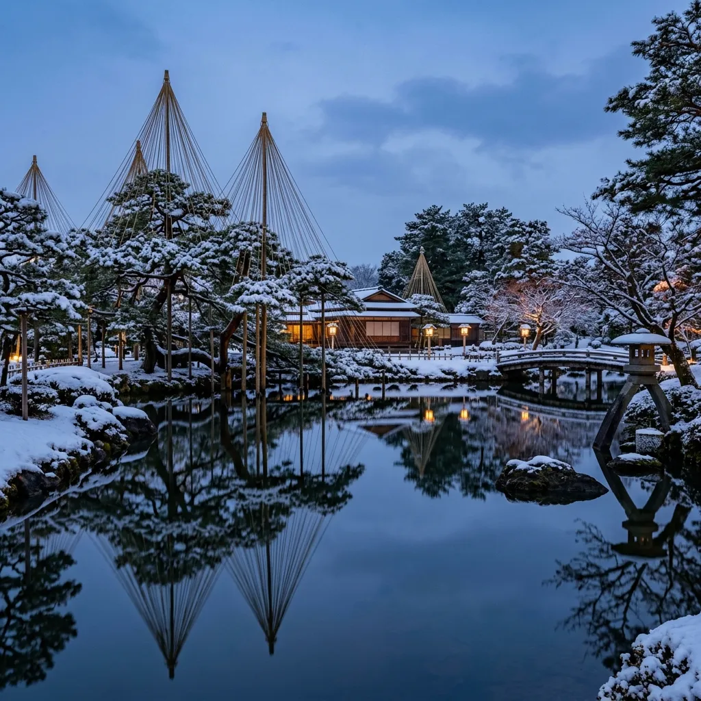 - Kenrokuen: Considerado uno de los tres jardines más bellos de Japón. Su diseño busca la perfección en seis atributos: amplitud, reclusión, artificio, antigüedad, agua abundante y vistas panorámicas. En invierno, los “yukizuri” (cuerdas que protegen los pinos de la nieve) crean siluetas geométricas preciosas.